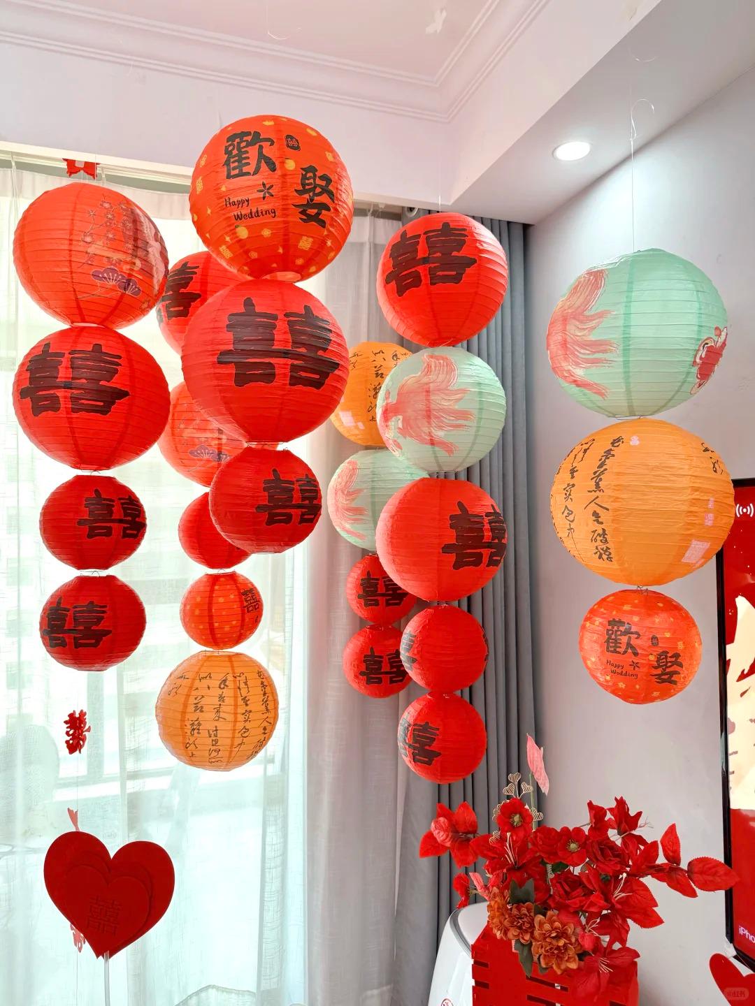 给灯笼来个特写,上面写着和“囍”字,“欢喜”,“娶亲”、“金鱼”等喜庆的图案和滋养。有了这些灯笼做点缀,视觉效果立马丰富了不少,也是满满的喜庆氛围。