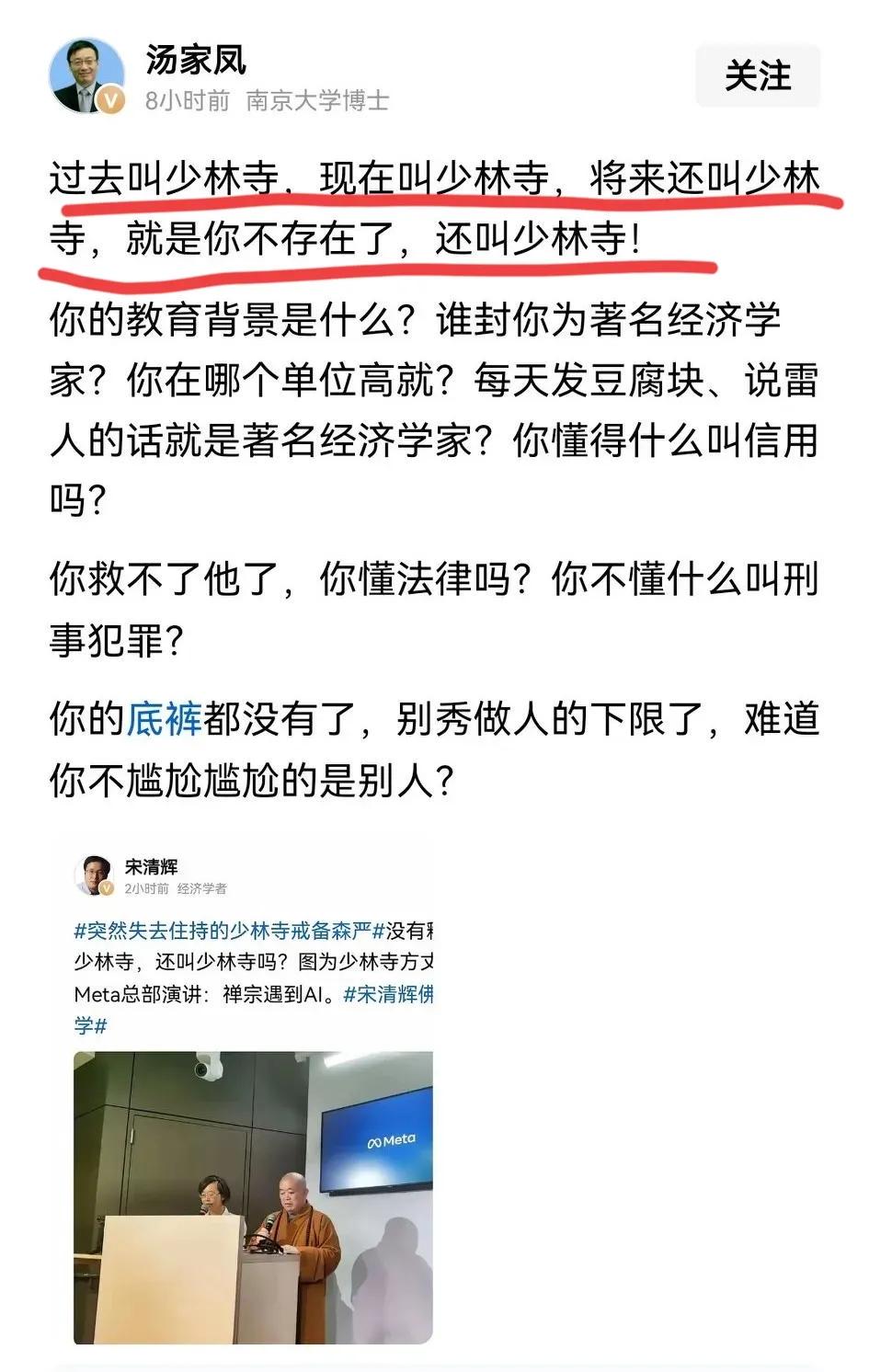 汤家凤怒斥宋清辉,经济学家的名头都是自己封的,连最基本的法律都不懂,释永信触犯的是刑事犯罪,不仅仅是裤裆里的那点事。