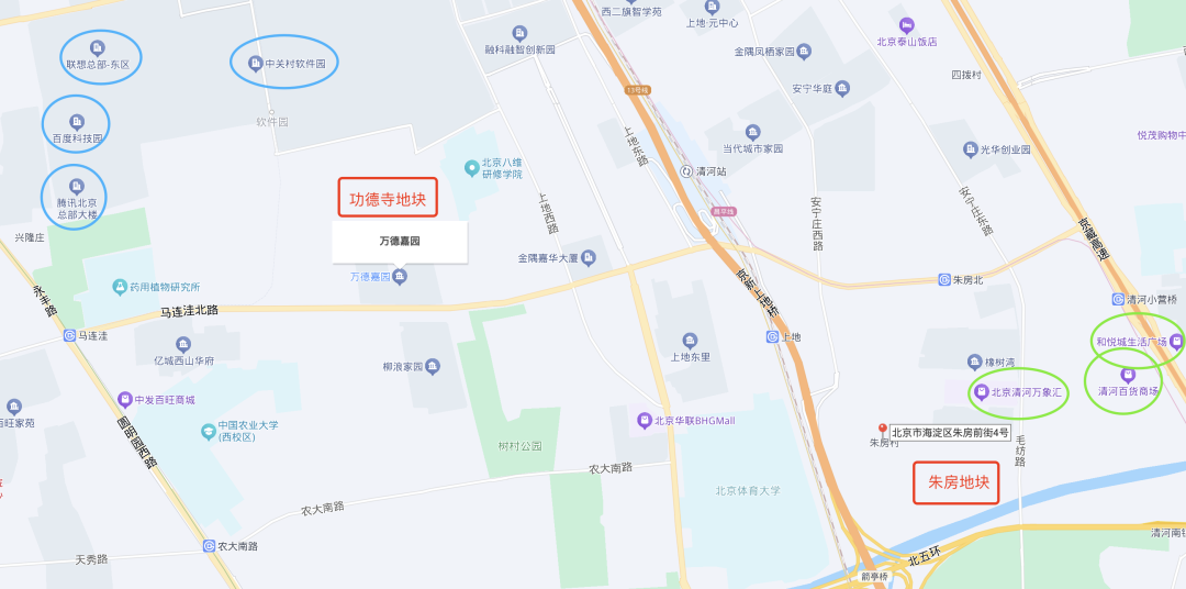 北侧直线距离约300米为中关村软件园,百度、腾讯等总部林立,截止2023年园内企业达792家,总收入占海淀GDP的51%。