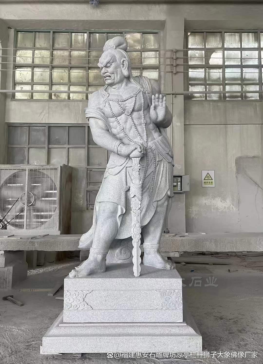首先,哼哈二将的面部表情是非常具有对比性的,这一点在石雕作品中表现得尤为明显。一般来说,哼将(俗称“哼将”)的面部表情严肃、刚毅,眉头紧锁,眼神威猛,给人一种强烈的威慑感。这种面部表情往往表现出他作为“护法神”威武的神性特质,意图震慑邪恶力量。与此同时,哈将(俗称“哈将”)则常常带有微笑或者更柔和的面部表情,眼神温和,嘴角上扬,体现出一种宽容与包容的力量。这种面部表情的差异,正反映了哼哈二将性格上的互补性,哼将代表着刚猛、威武的一面,而哈将则代表着柔和、仁爱的另一面。
