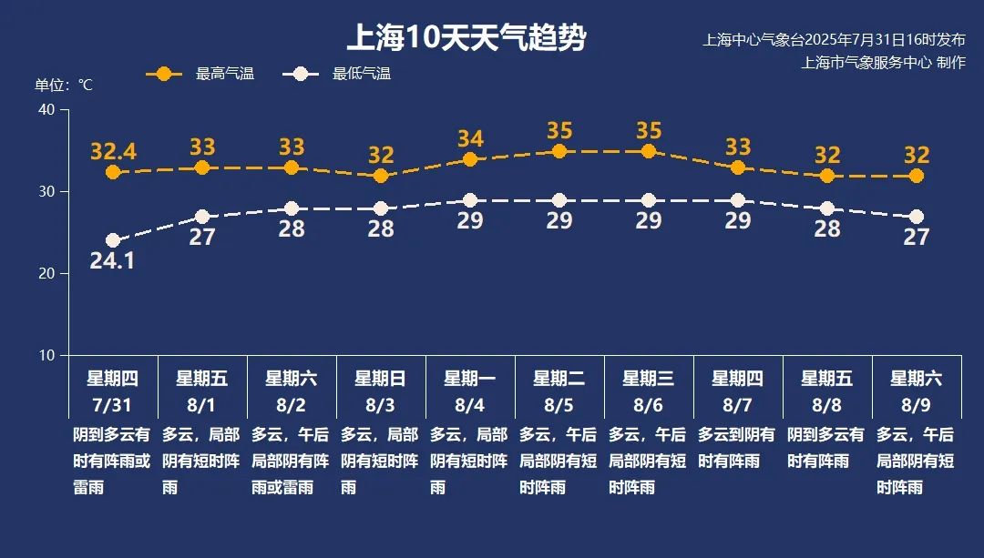 周六午后到周日,“竹节草”的残余环流有所发展,上海还会出现较明显降水,气温维持在28-33℃之间。