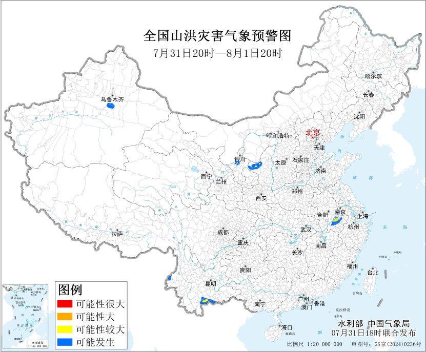 预计,7月31日20时至8月1日20时,内蒙古西南部、安徽南部、云南西部和南部、陕西西北部、宁夏北部、新疆中部等地部分地区可能发生山洪灾害(蓝色预警),其中,安徽南部、云南南部、陕西西北部局地发生山洪灾害可能性较大(黄色预警)。