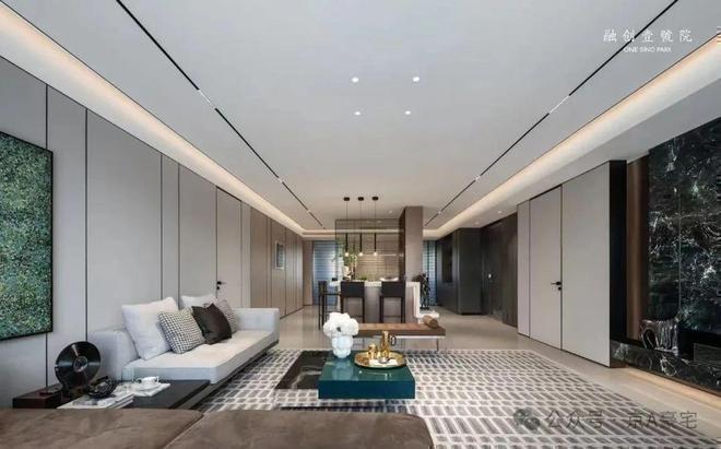 三玻两腔Low-E超白钢化玻璃幕墙窗,双层镀膜阻挡紫外线,内部惰性气体填充,有效阻隔热传导途径,集隔音、降噪、隔热、保温于一体,搭配德国旭格推拉窗及隐藏式合页、高品质五金,重塑标准之上的居住体验及室内宽景视觉冲击,辅以暖色石材与轻质金属线脚,横向线条美学韵律中,交织出现代、新锐、简约的浪漫质感,诠释艺术美学的审美张力。