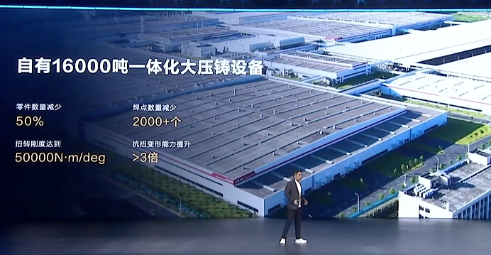 具体而言,奕派科技自有16000吨一体化大压铸设备,可使零件数量减少50%,焊点数量减少2000+加,扭转刚度可以达到50000Nm/deg。