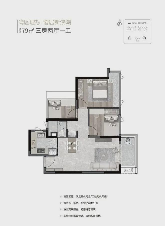 高得房率:来自深圳的爆款户型,79㎡3房1卫、89㎡3房2卫、105㎡4房2卫,全周期户型,90%以上超高得房率。