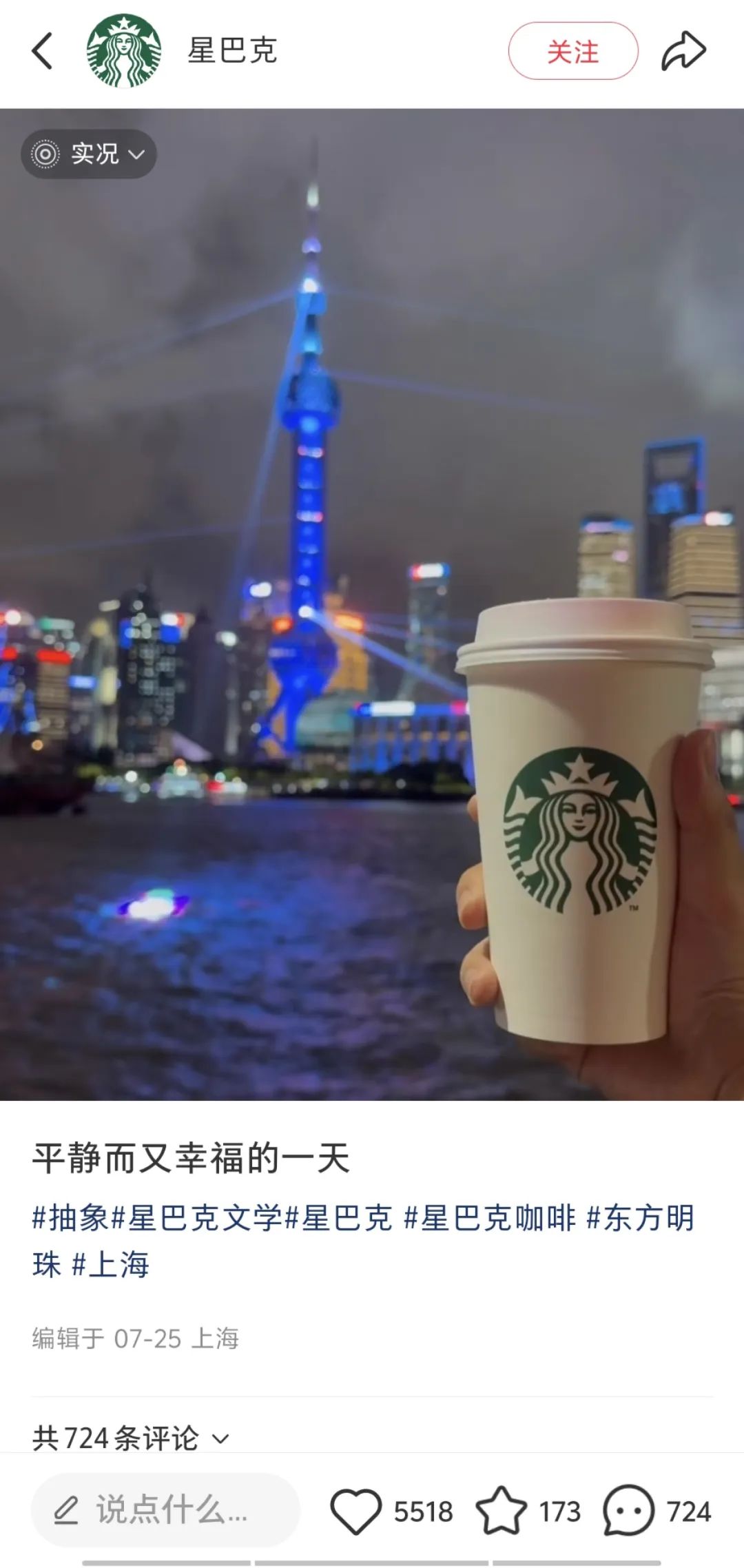 另一边星巴克则是云淡风轻,发了一张在东方明珠旁边手握咖啡的照片,附文:“平静又幸福的一天”。