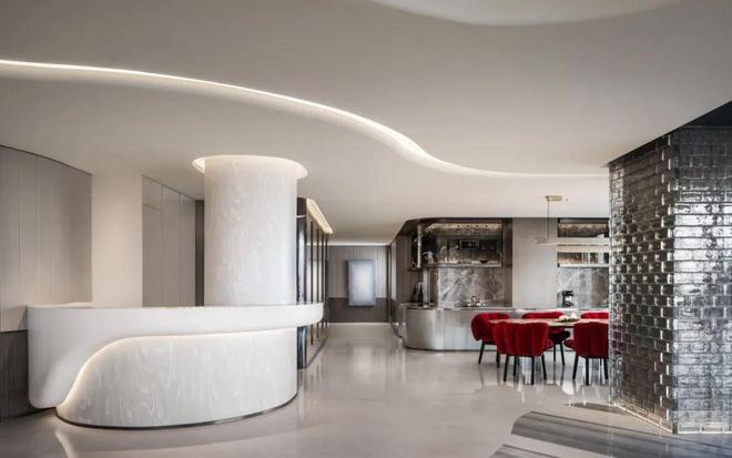 比如项目吊顶和木饰面转角处,运用大量弧线,视觉优雅。