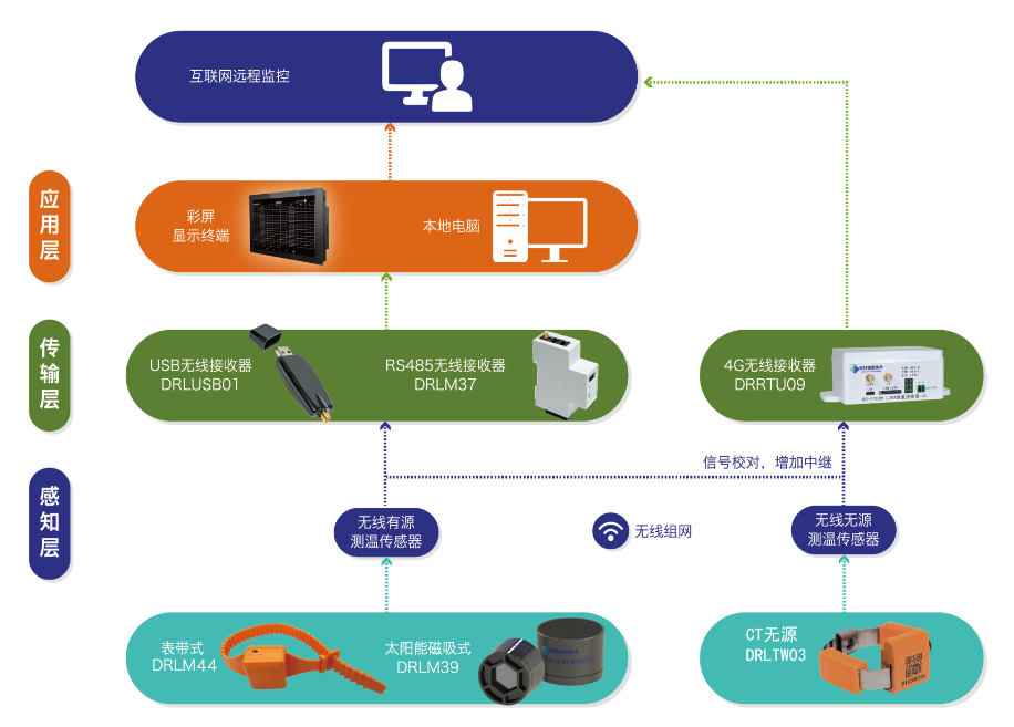 感知层通过温度传感器采集测温数据,利用LoRa组网方式集中接收并传输(RS485、4G等通讯方式)测温数据至本地显示终端、WEB等管理平台,实现对所有温度节点进行监测管控。