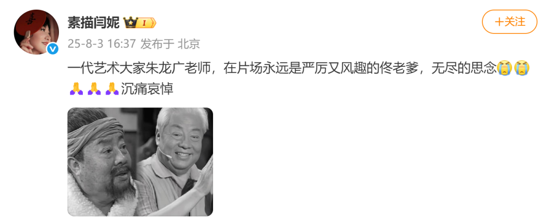3日下午,演员闫妮在社媒发文悼念:一代艺术大家朱龙广老师,在片场永远是严厉又风趣的佟老爹,无尽的思念,沉痛哀悼!