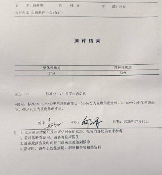 短短一篇小作文信息量巨大,与此同时,赵露思还附上了自己诊断为重度焦虑和抑郁的诊断单。