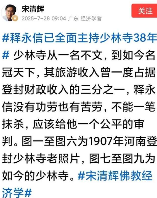 且不说他这些言论到底有没有道理,单是宋清辉的表述方式,就很容易引发争议,他在社交平台上写道:“没有释永信的少林寺,还叫少林寺吗?”