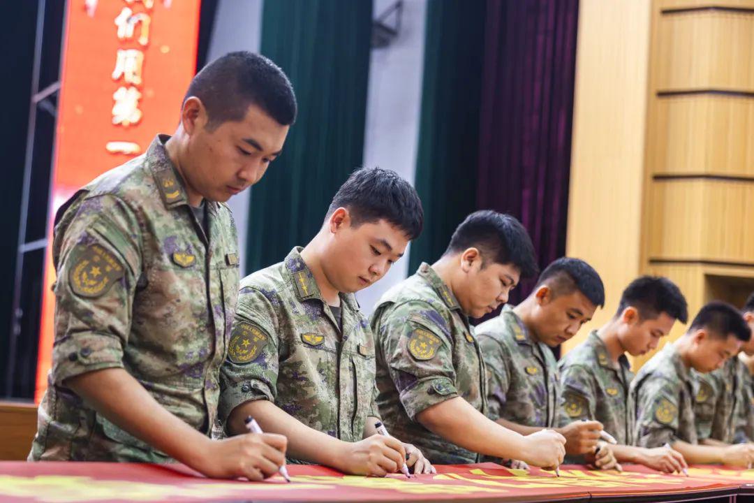随后,官兵们神情庄重,在印有“坚决保证完成任务坚决锻造胜战能力坚决捍卫第一荣誉”的鲜红横幅上郑重签名承诺。