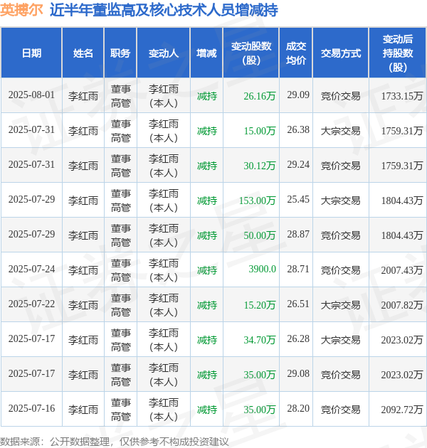 英搏尔近半年内的董监高及核心技术人员增减持详情如下: