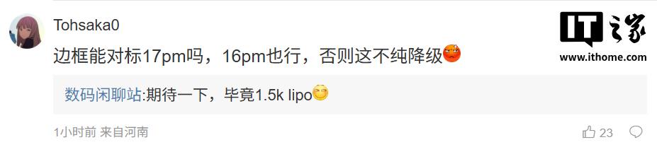 后续有用户在评论区询问:“边框能对标 17PM 吗,16PM 也行,否则这不纯降级 [愤怒]”,博主回复道:“期待一下,毕竟 1.5K LIPO [滑稽]”;另一位用户询问道:“看到潜望就安心了,这次会上 LUMO 影像吗?全面对标 1Phone [狗头斜眼]”,博主则回复道:“安排上了”。
