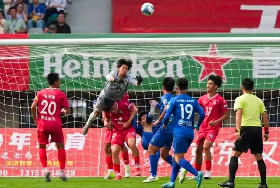 宿迁队前锋带球突入禁区,一记势大力沉的远射如炮弹般直扑球门死角,就在这千钧一发之际,盐城队25号门将严子航如猎豹般飞身而起,单掌将球托出球门上方横梁。现场的观众爆发出雷鸣般的掌声和惊叹声。