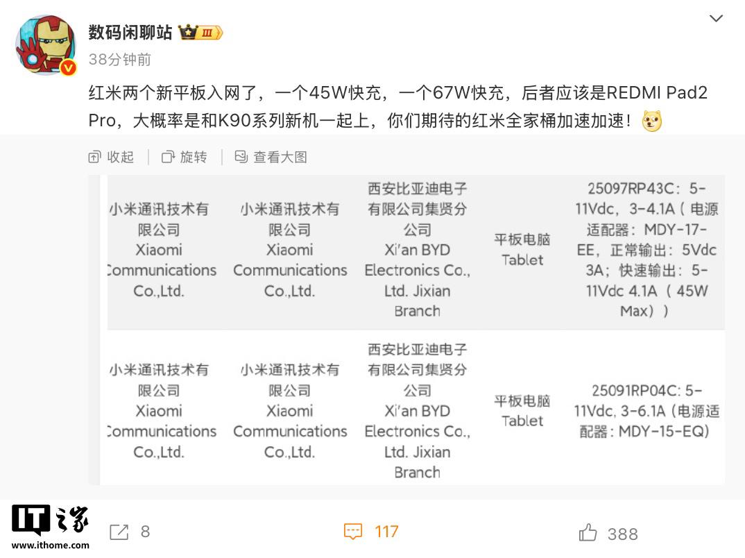 IT之家 8 月 5 日消息,博主 @数码闲聊站 发文,透露小米 REDMI 两款新平板入网,其中前者支持 45W 快充,后者支持 67W 快充,该博主透露其中后者为小米 REDMI Pad 2 Pro,预计将与 K90 系列手机同台登场。