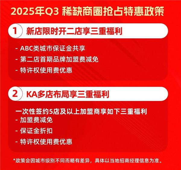 第三季度更有特惠政策。新加盟商在一店开业后6个月内签约二店,ABC类城市可进行保证金共享,两店特许权使用费均降为3500元/月。所有城市二店减免首期加盟费。