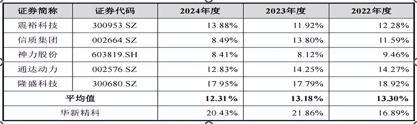 报告期各期,华新精科综合毛利率分别为16.89%、21.86%及20.43%,有所波动。与同行对比,公司综合毛利率高于可比同行均值13.30%、13.18%和12.31%,并且变动趋势异于同行。