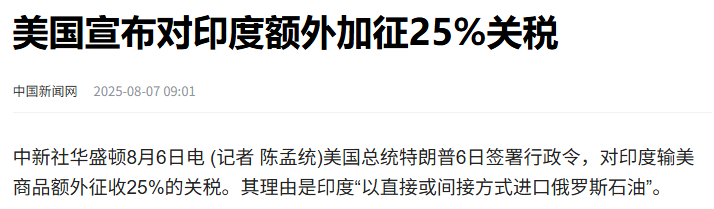 8月6日,特朗普继续发飙,在社交媒体上宣布要对印度额外加征25%的关税,美国对印度的关税将上升到50%,成了全球最高的国家之一。