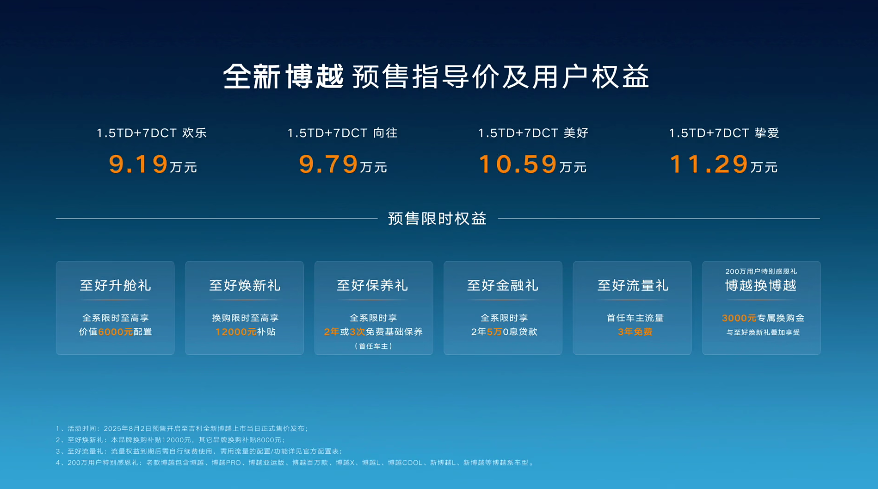 对比10万级SUV市场竞品,全新博越的优势不仅在于产品力,更在于"不玩套路"的实在权益。全系限时免费升级最高6000元配置,换购用户最高享12000元补贴,部分车型提供2年5万元0息贷款;首任车主享3年免费车机流量、2年或3次免费基础保养,210万老用户还能额外获3000元专属购车金,所有优惠明码标注,家庭用户无需猜测实际成本。