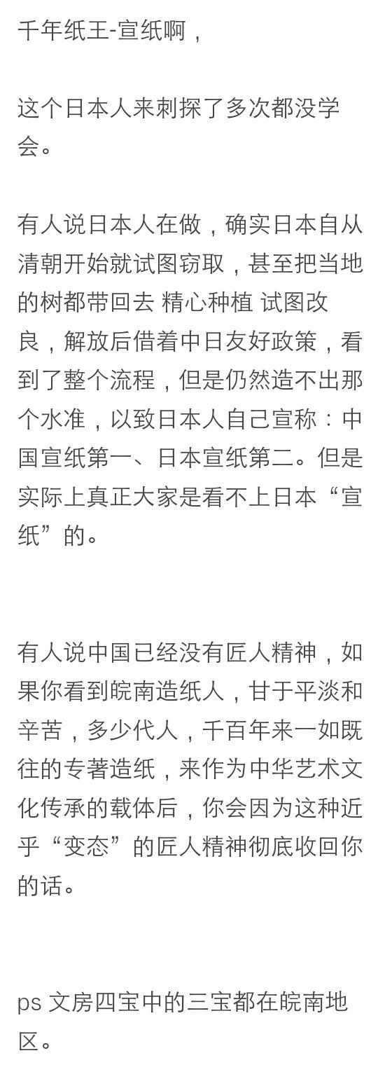 宣纸,日本造出来不如中国最主要原因是因为造宣纸用的水,因为水质的问题导致纸的质量怎么样都无法和中国宣纸媲美,技术工艺什么的早就被日本窃取过去了!当地特有的山泉水是成就宣纸决定性质量的关键因素。