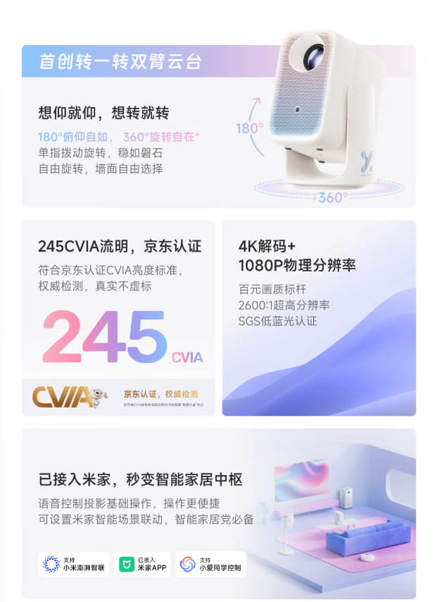IT之家从官方介绍获悉,这款新品首创转一转双臂云台,支持 180° 俯仰调节,360° 水平旋转调节,单手拨动即可满足全景方向,支持 40 寸-120 寸大屏。