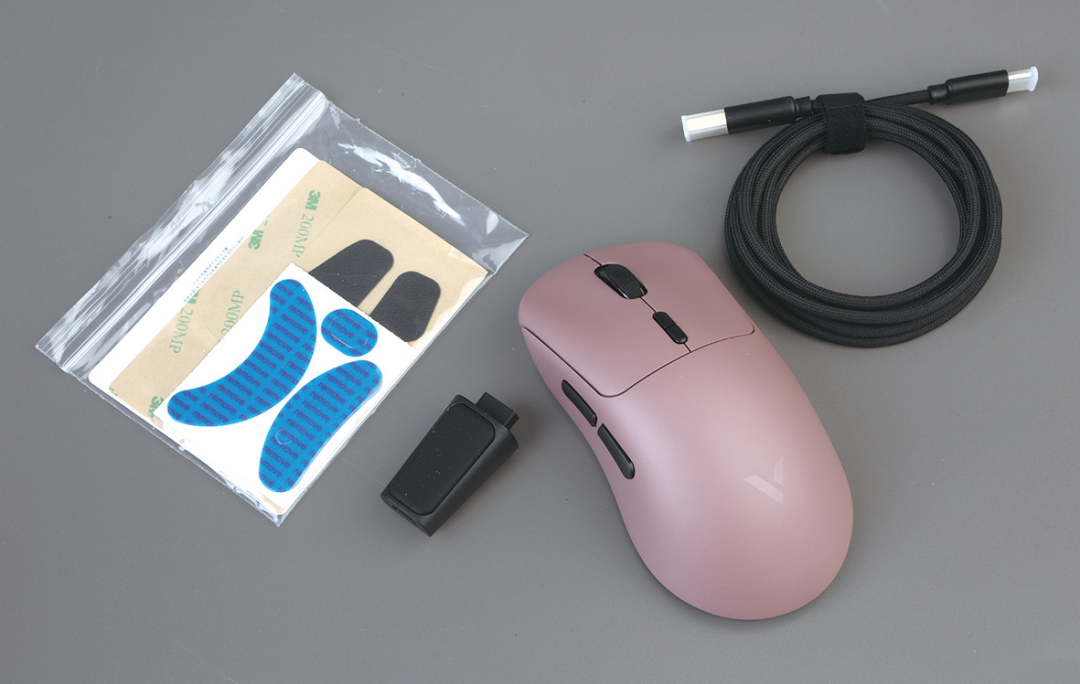 ▲在配件方面,雷柏VT3双模双高速游戏鼠标并没有做任何节省,同样配备了可替换的脚贴、伞绳线、nano USB收发器以及转接头。