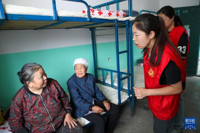 8月9日,在榆中县第三中学安置点医疗点,医护人员为受灾人员量血压。