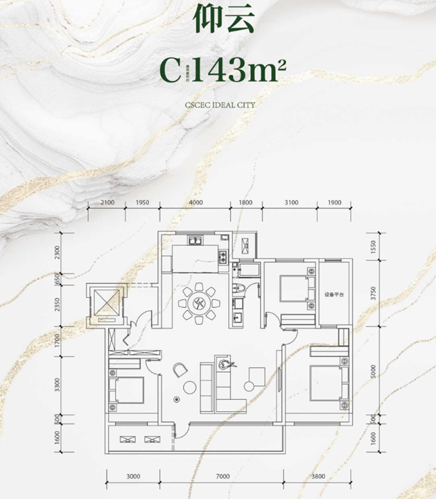 建面约143㎡户型整体空间布局上采用扁平化的设计,大面宽、短进深,最大提升空间使用率。