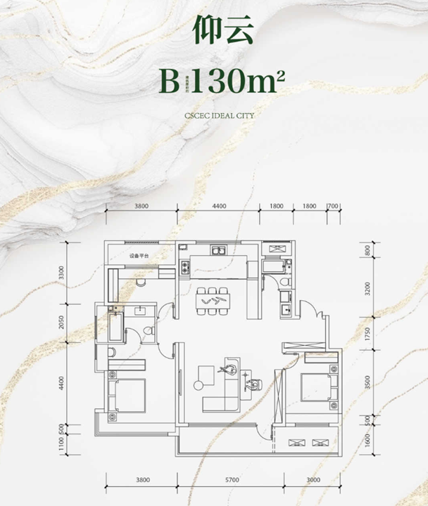 建面约130㎡户型同样的外跨阳台设计,三开间朝南、约5.7米面宽餐客厅、阳台一体化,U型厨房,干湿分离卫生间、套房式主卧,可满足生活多元化使用场景。