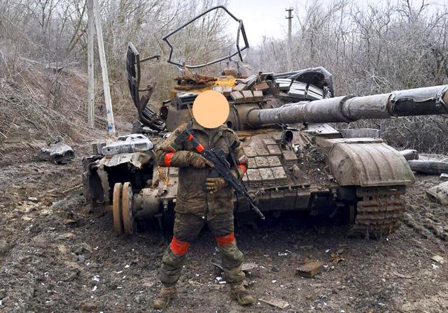 一名俄军士兵在“灰色地带”地雷障碍前与坦克合影,坦克特征是履带断裂