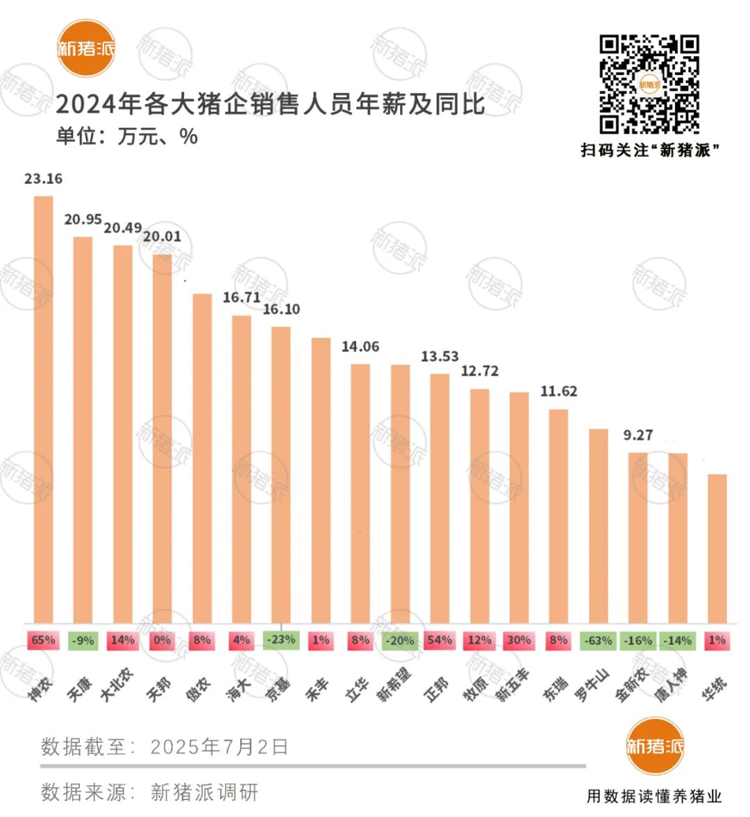 据新猪派调研,2024年18家上市猪企销售人员平均年薪为16.10万元,同比增长6.05%。其中神农集团销售人员平均年薪最高,为23.16万元;天康生物20.95万元,排名第二;大北农20.49万元,位列第三;天邦食品20.01万元,位居第四。其余企业销售人员平均年薪介于8万-18万之间。