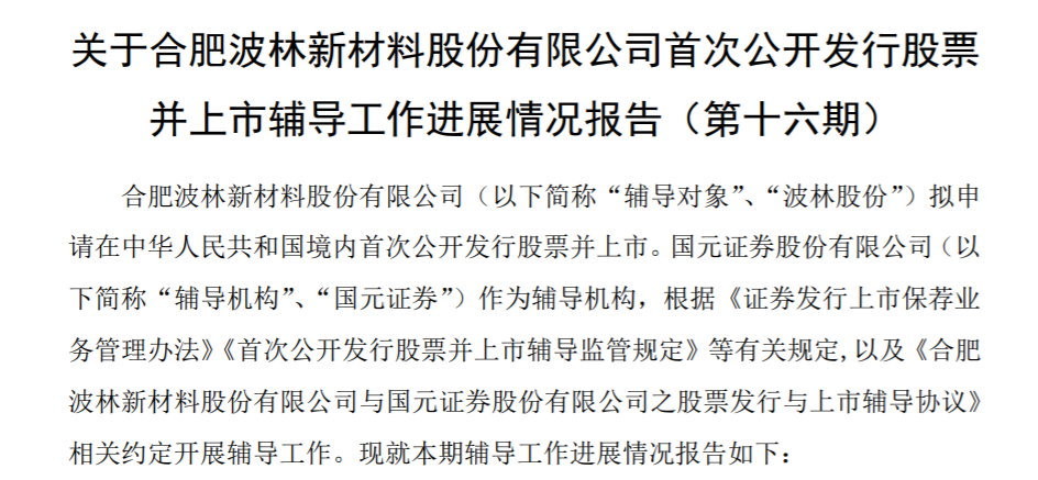 瑞财经 王敏8月7日,合肥波林新材料股份有限公司(以下简称“波林股份”)披露关于首次公开发行股票并上市辅导工作进展报告(第十六期),辅导机构为国元证券。