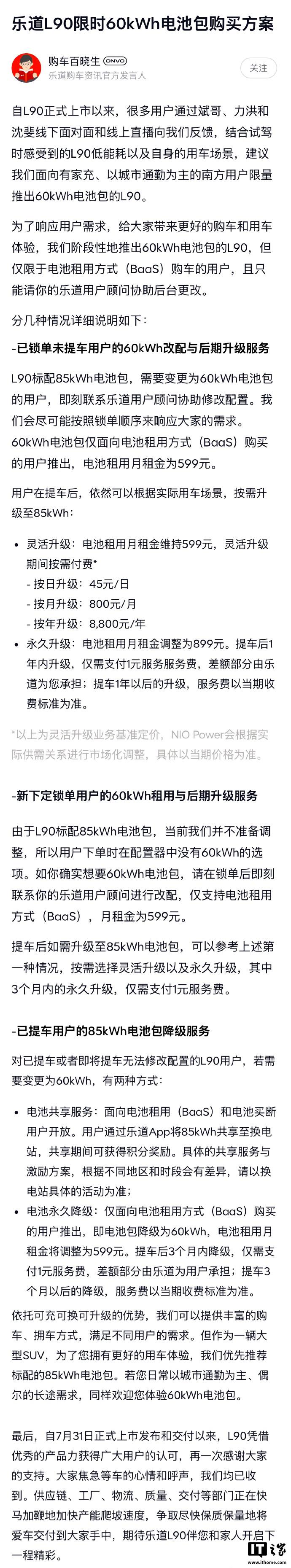 IT之家 8 月 11 日消息,乐道汽车发文,宣布乐道 L90 车型可选择 60 度电池包,已锁单还没有提车的用户可联系客服顾问进行改配,改配仅限于电池租用方式(BaaS)购车的用户,电池租用月租金为 599 元。