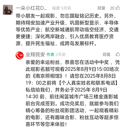 2️⃣第二步:在本条微信下方留言+点赞+在看,并在评论区留言“观影理由+对翔安发展的期待”,我们将在入选留言中随机抽取35位幸运儿,被抽中者即可获得2个观影名额,凭此观影名额可观看8月16日15:00场次的《南京照相馆》(此券不可转让售卖,不可兑换现金)。