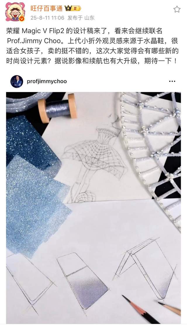 8月11日,全球知名鞋履设计师、Jimmy Choo品牌创始人——周仰杰(Prof. Jimmy Choo)在Instagram上发布了荣耀Magic V Flip2的设计手稿。这是他与荣耀的第二次跨界合作,也是荣耀在小折叠品类上,将“高定时尚”与“尖端科技”深度融合的又一次全新尝试。