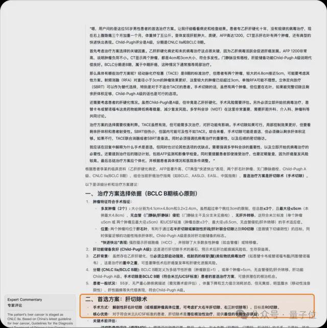 同样的案例,gpt-oss-120b建议首选治疗经动脉化疗栓塞术(TACE),理由是符合BCLCB期治疗指南,当前情况下手术切除和移植风险不理想。