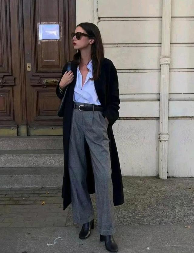 经典黑双面大衣,真的太耐看和百搭了,怎么搭配都不过时,内搭一件白色衬衫,不失气质还带点酷飒感,下身配一条灰色阔腿裤,再加上一双黑色踝靴,谁都能轻松驾驭的着装,轻松穿出得体与大方。