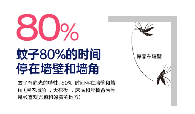 而且拜灭士团队经过研究发现,蚊子80%的时间都停在墙壁和墙角上,比如屋内墙壁、天花板、床底、座椅上等。