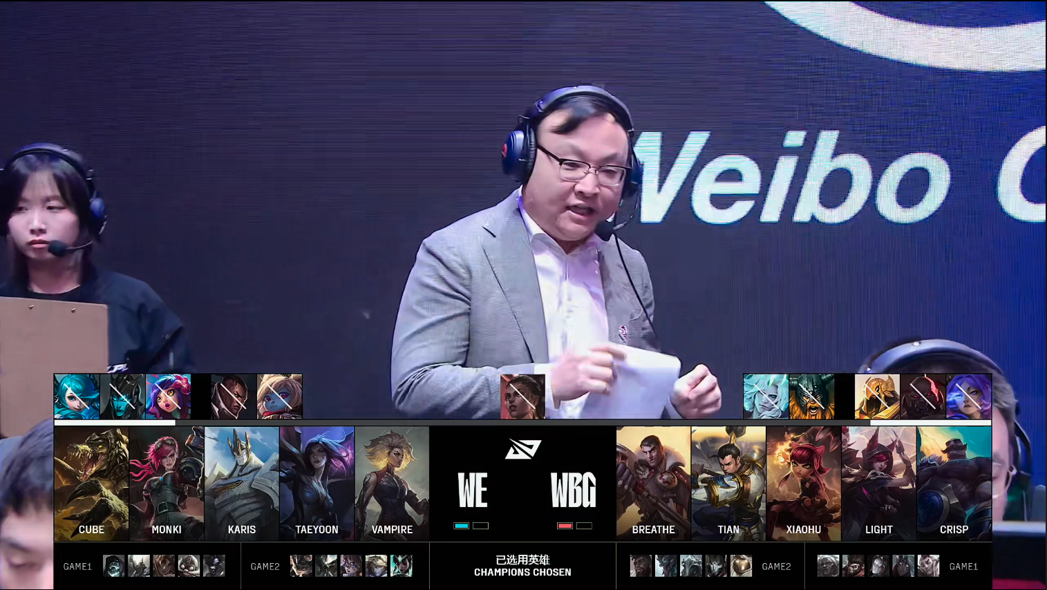 第二局比赛,WBG蓝色方,禁用:赛恩、卡莎、阿卡丽、皇子、芮尔,选用:Breathe奎桑提、Tian巨魔、Xiaohu维克托、Light烬、Crisp巴德;WE红色方,禁用:芸阿娜、格温、沙皇、希维尔、卢锡安,选用:Cube兰博、Monki蝎子、Karis阿萝拉、Taeyoon伊泽瑞尔、Vampire卡尔玛