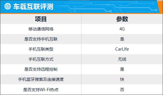 车载互联部分,评测车支持4G车联网以及手机APP远程功能,另外手机蓝牙的搜索及连接速度都相当不错,日常使用体验感较好。手机互联方面,系统仅支持CarLife,适配性表现比较一般。
