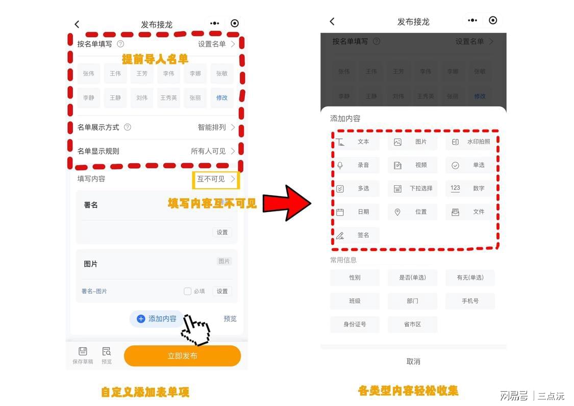 微信接龙只能收文字?接龙管家可厉害多了!文本、图片、音频、视频、文件、定位、签字…… 想收啥就加啥表单项: