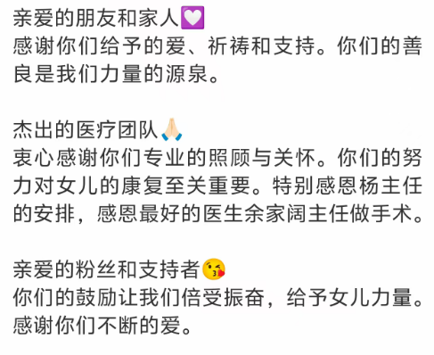 随后,钟丽缇感激了所有身边的朋友和家人 ,感谢他们给自己爱和祈祷,称他们的爱和善良是自己力量的来源。同时,钟丽缇也特别感谢了给孩子做手术的主刀医生和医疗团队。钟丽缇感谢了一直以来支持自己的粉丝朋友,称是大家的鼓励才让自己备受振奋,给予女儿力量。