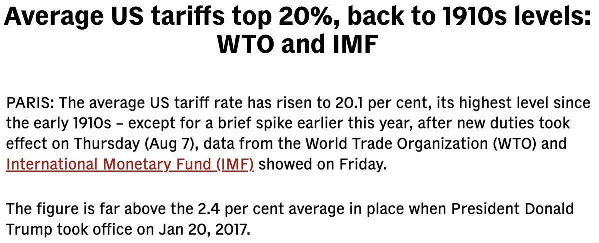 世界贸易组织(WTO)和国际货币基金组织(IMF)8日公布的数据显示,随着新关税的实施,美国对全球所有产品的贸易加权平均关税税率已达20.1%,大幅高于年初本届美国政府上台前的2.4%,为110多年来的最高水平。