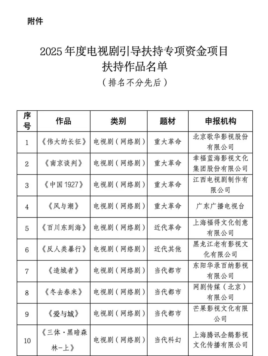 按照2025年度电视剧引导扶持专项资金项目工作安排,经各省级广电行政部门、中央有关单位推荐,国家广播电视总局评审并公示,最终确定扶持项目15部,现将扶持项目名单予以公布(详见附件)。