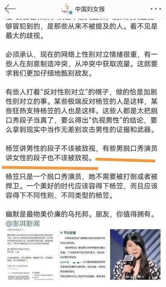 以往,女性脱口秀演员怎么说男人骂男人都没事,男生不舒服了,有意见了,还会遭遇舆论和官媒的进一步攻击和群嘲,甚至与那些男性相关品牌的宣传部门的仙女,还会公器私用让那些女权脱口秀演员代言。
