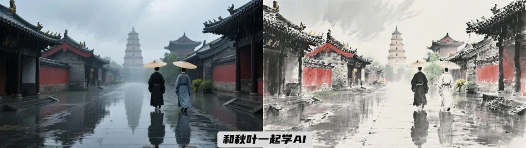 例如,我们可以想象一个雨水化作墨迹流淌的转场画面,用首尾帧图试试生成效果。