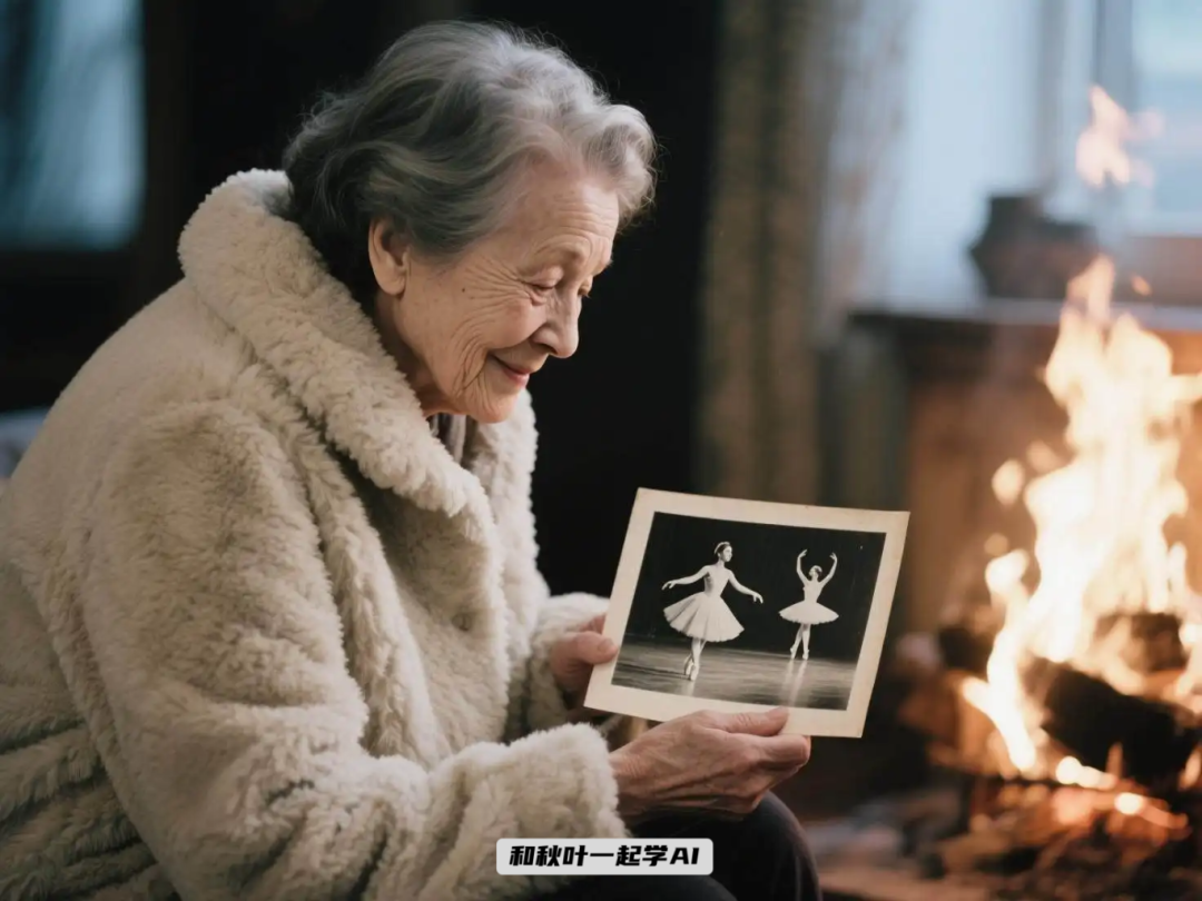 比如,我先用即梦或者豆包生成一张母亲在火炉边看老照片的图片。