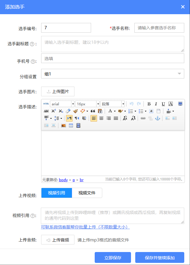 5.添加参赛创业家资料:根据活动需求,选择是否开启选手报名功能。若不开启,可由主办方统一上传,包括企业家的姓名、主要成就、个人照片等。