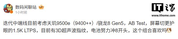 据爆料,该迭代中端线目前考虑天玑 9500e(9400++)/骁龙 8 Gen5,AB Test,屏幕切更护眼的 1.5K LTPS,目前有 3D 超声波指纹,电池努力冲 8 开头(8000mAh)。